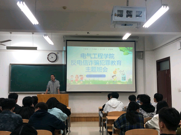 为进一步加强学生防电信网络诈骗意识,切实保护好大学生的生命财产安全,创建平安和谐校园环境。10月9日晚7点,电气工程学院在8号教学楼组织开展“严防电信网络诈骗违法犯罪教育”主题班会。20级、21级、22级的班主任老师及全体同学参与了此次活动。