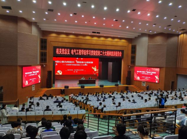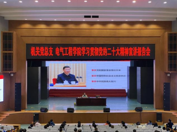 宏伟蓝图激荡人心,号角声声催人奋进。为深入学习宣传贯彻党的二十大精神,加强师生党员的培养教育,提升入党积极分子的理论素质,引导全院师生听党话、感党恩、跟党走。2022年11月8日下午两点半,电气工程学院在千人礼堂开展了学习贯彻党的二十大精神宣讲报告会。我院党总支特邀马克思主义学院刘娟老师作报告,我院党总支书记杜常青同志、院长李宏伟同志,学院全体教师及辅导员,以及全体学生党员、预备党员、入党积极分子参与了此次宣讲活动。