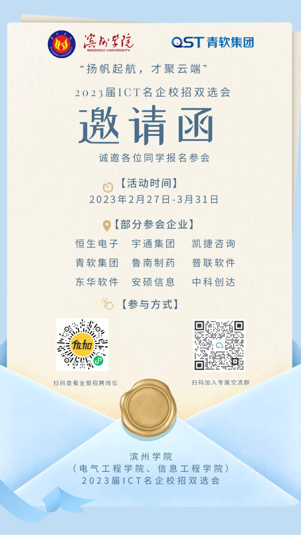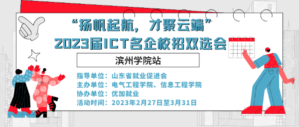 为响应国家“稳就业”、“保就业”决策部署,扎实做好“2023届全国普通高校毕业生就业创业促进行动”,在山东省就业促进会的指导下,由滨州学院电气工程学院、信息工程学院联合优加就业举办的“扬帆起航,才聚云端”-2023届ICT名企校招双选会。在2023年2月27日至3月31日期间,邀请50余家知名企业参与本次双选会。本双选会旨在搭建政府、企业、高校和学生四方沟通平台,提供高质量岗位信息,优秀人才资源,助力2023届毕业生春季招聘活动顺利完成。