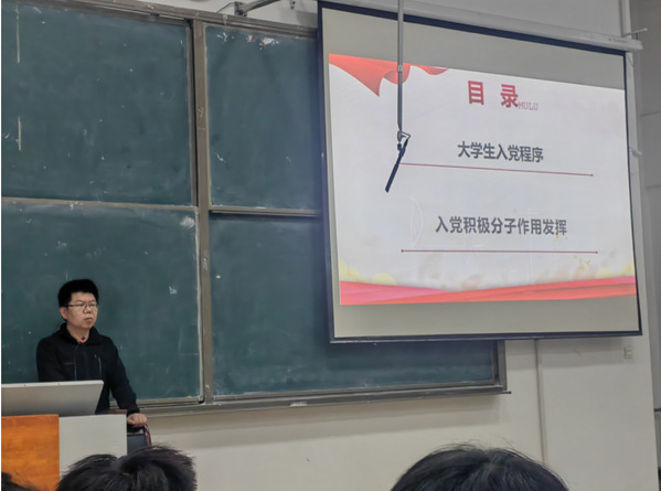4月21日晚,我院赵建斌老师8教305教室主持开展了入党积极分子培训工作。本次培训主要从两方面开展,一是大学生的入党程序,二是入党积极分子作用发挥。培训中,赵老师讲到党组织对要求入党的积极分子进行为期一年以上的培养教育和考察,要对发展对象进行短期集中培训等。最后,赵建斌老师,希望各位入党积极分子要严于律己,以实际行动向党组织靠拢。