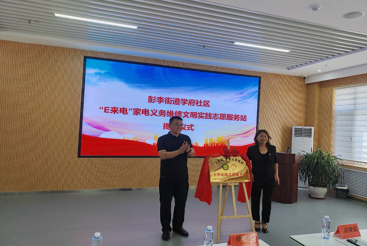 为深入学习宣传习近平新时代中国特色社会主义思想,贯彻落实习近平总书记关于青年工作的重要指示精神,引导和帮助广大青年学生上好与现实相结合的思政课,鼓励青年学生走出学校、走进社会,扎根深入基层、了解国情民情,加强校地合作,培养学习应用实践综合素质人才。2023年7月8日,滨州学院电气工程学院在彭李街道学府社区举行以“学习党的二十大 永远跟党走 奋进新征程”为主题的2023年暑期“三下乡”社会实践活动启动仪式暨学府社区“E来电”家电义务维修文明实践志愿服务站揭牌仪式。电气工程学院党总支副书记张志,团总支书记赵建斌,辅导员徐可、盛杰,“E”点爱志愿服务团成员及学府社区工作人员参加活动。活动由学府社区党总支书记何向君主持。