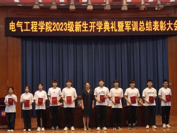 全场起立,在慷慨激昂的国歌声中,新生典礼正式拉开帷幕。首先由我院党总支副书记张志宣读校级“军训优秀志愿者”名单并颁发荣誉证书;副院长贾荣丛宣读校级“军训优秀标兵”名单并颁发荣誉证书。然后由我院教师代表毕志敏向踏上大学新征程,进入电气工程学院这个和谐友爱大家庭的同学们表示热烈的欢迎,并寄语2023级全体新生:一是希望同学们珍惜学习机会;二是希望同学们培养综合素质;三是希望同学们树立正确人生观;四是希望同学们发展自己的兴趣和特长;五是希望同学们树立正确的职业规划。