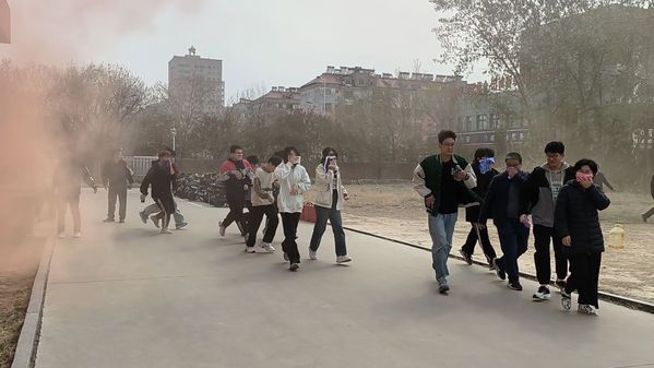 培训结束后,师生们进入指定教室模拟应急疏散演练。随着报警声响起,师生们用湿毛巾捂住口鼻、弯腰俯身,快速有序地从11号教学楼内安全出口前往西侧广场安全地点集合,疏散指挥人员迅速集合清点参与人员,确保所有人都顺利撤离。