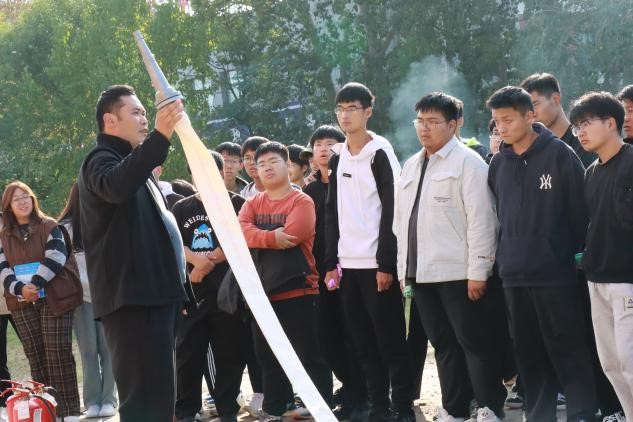 王亮亮向全体师生宣讲了火灾逃生及火灾报警注意事项,讲解了灭火器及消防栓的使用方法并作灭火示范。师生们纷纷上前尝试,手持灭火器、消防栓,现场体验灭火过程。