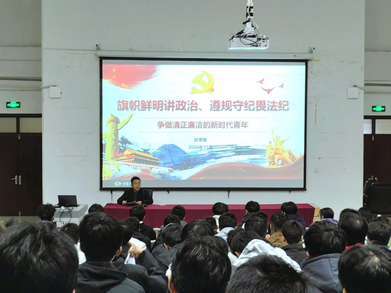 为深入学习贯彻党的二十届三中全会精神,进一步推进学院党风廉政建设工作,培养清正廉洁的新时代青年。2024年11月15日,电气工程学院党总支书记杜常青在8教106教室讲授“旗帜鲜明讲政治、遵规守纪畏法纪”专题党课,学院2024年入党积极分子、入团积极分子、部分2024级新生共120人参加。