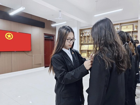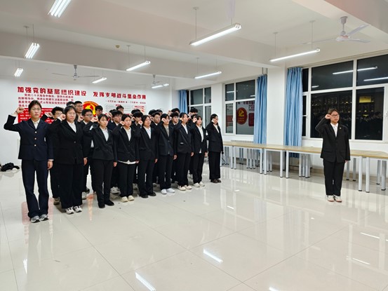 在团员代表徐域鑫的领誓下,新团员们面向团旗,右手握拳举过肩,在团旗下庄严宣誓。宣誓结束后,学院团员代表给新发展团员佩戴团徽并颁发团员证。