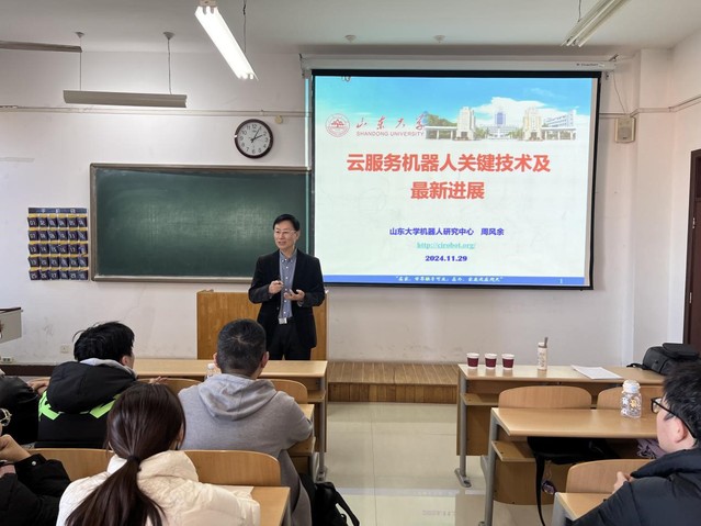 11月29日,山东大学控制科学与工程学院博士生导师周风余教授应邀来我校航空大讲堂作题为《云服务机器人关键技术及最新进展》的学术报告。周风余教授阐述了大数据、云计算、开源访问、ROS和机器人协作学习等云服务机器人的五要素,针对云机器人的核心技术-云服务平台和云脑逻辑结构设计进行了详细的分析,并对场景感知和智能识别技术在云服务机器人中的应用进行了展望。