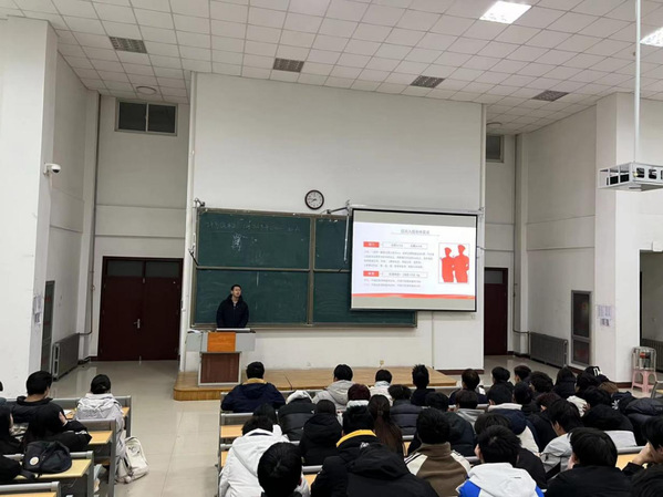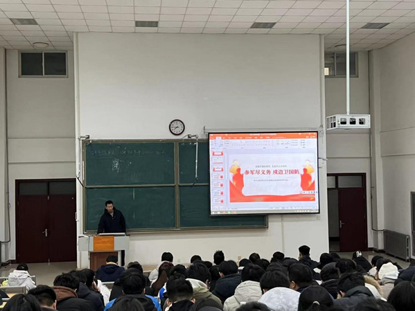 李梦超就征兵工作政策进行了全面讲解,对征兵工作的预征对象、身体条件、学费减免、落户要求、复学助学等情况作了详细介绍;对大学生入伍、报考军校和退役后复学考研、自主择业等方面享有的政策进行了详细解读,旨在让学生们充分了解参军入伍的实惠和好处。同时,他鼓励广大青年学子积极参与国防事业,将青春奉献给国家的建设和发展。并希望同学们在保家卫国的军营里实现人生价值;心系国防建设,把个人的理想追求融入国家和民族事业;响应祖国号召,积极投身军营,履行公民义务;珍惜军旅生涯,磨炼意志品格,增强综合素质,为未来发展夯实基础。