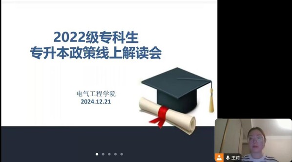 2024年12月21日,电气工程学院通过腾讯会议召开专升本政策解读宣讲会。会议由辅导员王莉主持,2025届专科毕业生参加。