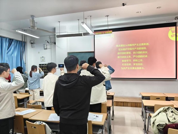在团支书的带领下,团员们高举右拳,面向团旗,宣读入团誓词,重温入团的光荣热血与使命担当。