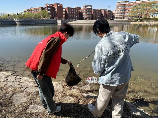 活动当天,志愿者们身着统一红色马甲,分为湖泊清洁、绿化维护、公共区域整治三个小组开展行动。重点对聚英湖沿岸漂浮物、环湖步道落叶进行清理,深度清扫教学楼周边绿化带中的隐蔽垃圾,并对宣传栏、路灯杆等公共设施进行擦拭维护。志愿者们手持环保垃圾袋、长柄夹等工具,细致排查卫生死角,累计清理各类垃圾20余袋,实现垃圾分类投放。活动过程中,不少非志愿者同学被现场热烈氛围感染,主动加入志愿者队伍,大家齐心协力,让校园环境越来越整洁。