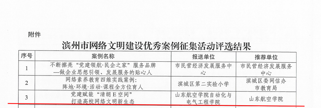 日前,滨州市委宣传部、市委网信办发布《关于滨州市网络文明建设优秀案例评选结果的通报》,我院作品《党建赋能“清朗E空间”:打造高校网络文明新生态》荣获滨州市网络文明建设优秀案例。