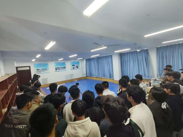 活动现场,一辆辆造型精巧、行动迅捷的智能循迹车吸引了大家的眼球,它们在场地上沿着预设路线灵活穿梭,精准完成各项任务。多自由度机械臂流畅地完成抓取、搬运等操作,引得同学们阵阵惊叹。实验室成员详细演示了这些科技作品的奇妙之处,还耐心地向新生们介绍了其背后的设计原理、技术难点以及团队备赛的精彩故事。他们鼓励新生们尽早确立目标,主动学习,积极投身到科技创新实践中来。新生们表现出极大的好奇与热情,他们围在操作台前,认真观察,并不时就自己关心的问题与学长学姐和老师进行交流。