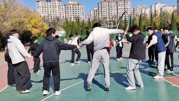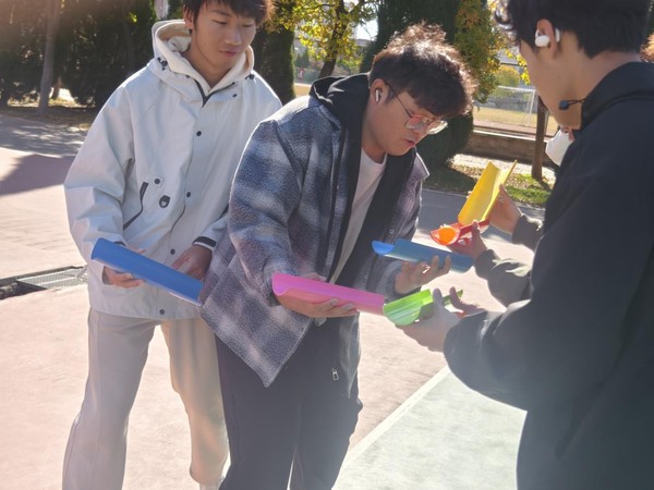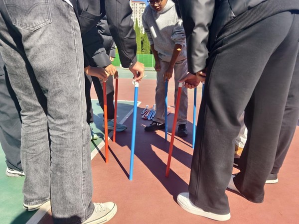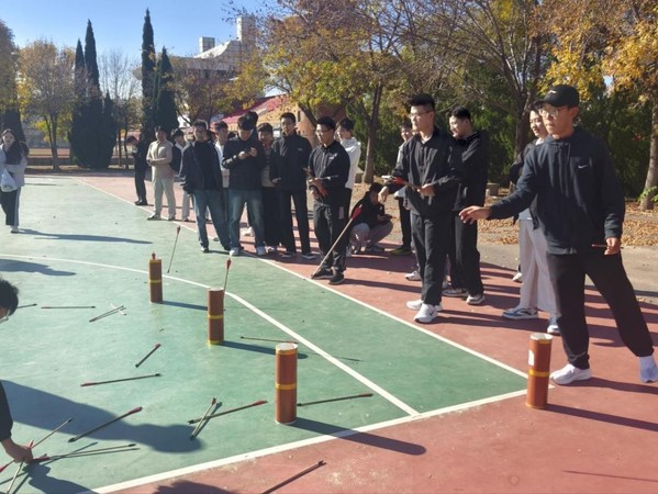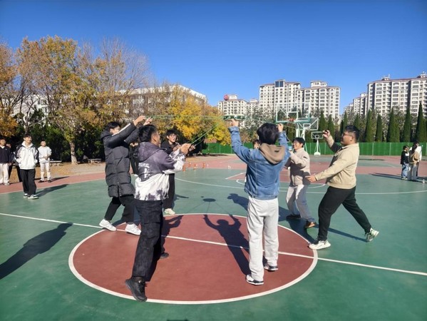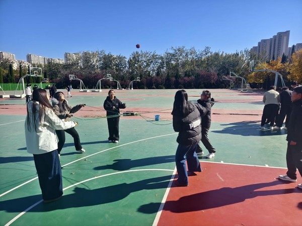 活动围绕“协作”与“趣味”两大核心,精心设置“百发百中”“珠行万里”“传呼啦圈”“不倒森林”“左右开弓”五大项目。既有考验精准度的个人能力展现,更有侧重团队配合的协作比拼,让新生在欢乐竞技中打破隔阂、凝聚共识。活动开始前,志愿者详细讲解各项目规则与安全注意事项,通过示范演练帮助新生快速掌握操作技巧,现场新生热情高涨,跃跃欲试。“百发百中”中,6名同学拉紧木鼓弹力绳,精准配合击打沙包;“珠行万里”里,队员们手持球槽接力传乒乓球,快速补位确保球不落地;“传呼啦圈”时,大家手拉手不松开,灵活传递呼啦圈;“不倒森林”环节,围圈奔跑的同学及时接棒塑料管,不让其倒地;“左右开弓”比拼中,三人一组投壶,合力冲击8支箭的目标。每个项目都充满挑战,篮球场上,同学们的呐喊声、笑声此起彼伏,陌生感在协作中消散,默契在互动中升温。