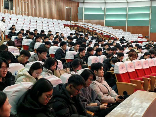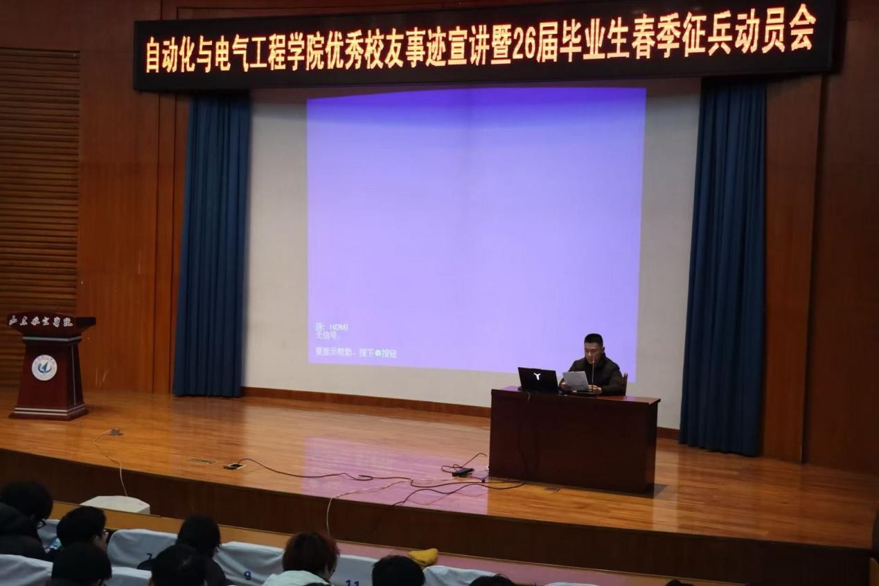 为充分发挥优秀校友榜样示范引领作用,进一步激发全院学子参军报国、建功立业的责任感与使命感,扎实推进2026届毕业生春季征兵工作,结合大思政课建设安排,2025年12月21日,365上市公司于明德报告厅举办优秀校友事迹宣讲暨2026届毕业生春季征兵动员会,学院“E课堂”宣讲团邀请2023届毕业生陈志超进行宣讲,辅导员王莉主持,全体2026届毕业生参会。